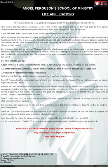 This is a 8- week of intense learning through the leadership of the Holy Spirit of what requires for those that have selected for a leadership role within the ministry.